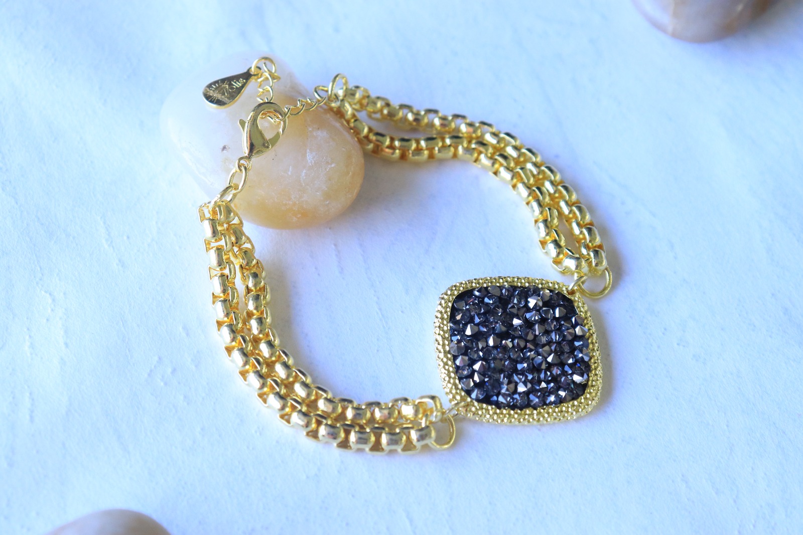 اسوارة سوليس ذهبي وبالوسط شكل مربع مرصع باحجار سوداء