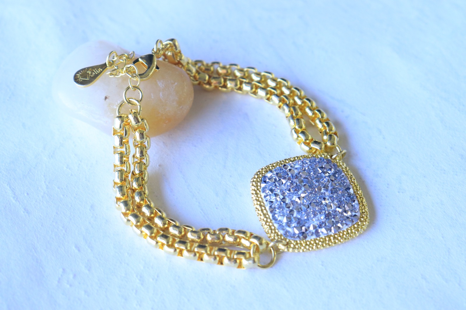 اسوارة سوليس ذهبي وبالوسط شكل مربع مرصع باحجار فضية